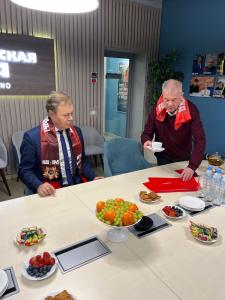 - Почему я пришел вот с этим флагом, а Николай Васильевич… Николай Васильевич Арефьев с шарфом. Итак, мы сегодня отмечаем…
