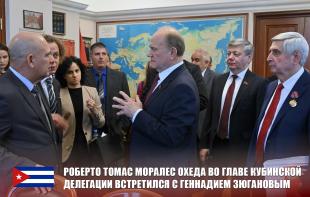 Общение с кубинской делегацией продолжилось в рабочем кабинете Г.А. Зюганова. В ходе беседы были обсуждены планы совместной деятельности. Роберто Томас Моралес Охеда поблагодарил своих российских товарищей за тёплый приём и систематическую поддержку. Руководство КПРФ высоко оценило поддержку Кубой той борьбы, которая ведётся Россией с бандеровским неофашизмом.