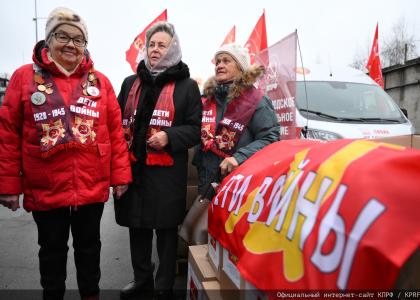 - Уважаемые товарищи! Хочу присоединится к добрым словам и пожеланиям Геннадия Андреевича Зюганова в адрес всех наших товарищей, и в первую очередь тех, кто сегодня здесь отправляет очередной наш гуманитарный конвой. Всех тех, кто активно нам помогает по сбору и отправке наших конвоев. Не случайно мы сегодня начали разговор и вышли на связь с Брянским обкомом КПРФ, они еще на Пленуме попросили помощи, так как прифронтовая зона осталась без присмотра, без продовольствия. И в ближайшие дни мы им отправили конвой. И вот сегодня многотонная фура там разгружается, плюс сегодня еще пойдет груз, включающий все необходимое. Там живут люди, и мы обязаны им помочь.