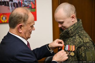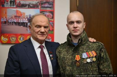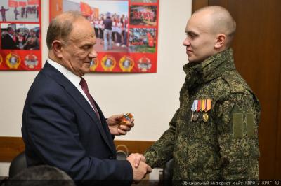 В ходе встречи Председатель ЦК КПРФ вручил награду бойцу СВО Владиславу Кришталю.