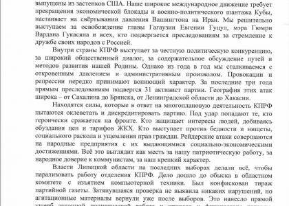Внутри страны КПРФ выступает за честную политическую конкуренцию, за широкий общественный диалог, за содержательное обсуждение путей и методов развития нашей Родины. Однако из года в год мы сталкиваемся с откровенным давлением и административным произволом. Провокации и репрессии нередко принимают вопиющий характер. За последние три года прямым преследованиям подвергся 31 активист партии. География этих атак широка – от Сахалина до Брянска, от Ленинградской области до Хакасии.