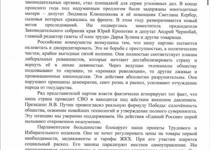 Находятся силы, которые в ответ на многоплановую деятельность КПРФ пытаются оклеветать и дискредитировать партию. Под удар попадают те, кто героически сражается на фронте. Кто защищает интересы людей, добиваясь обуздания цен и тарифов ЖКХ. Кто выступает против бедности и нищеты, социального раскола и ущемления прав граждан. Рейдерские атаки совершаются на народные предприятия с их выдающимися социально-экономическими достижениями. Всё это выглядит как месть за нашу патриотическую работу, за народное доверие к коммунистам, за наш крепкий характер.