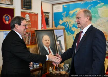 В рабочем кабинете Г.А. Зюганова в Государственной Думе состоялась встреча с кубинской делегацией во главе с министром иностранных дел Бруно Родригесом Паррилья. В ней приняли участие: Председатель ЦК КПРФ Г.А. Зюганов, первый заместитель Председателя ЦК КПРФ И.И. Мельников, заместитель Председателя ЦК КПРФ Д.Г. Новиков, секретарь ЦК КПРФ А.А. Ющенко. Прежде всего, речь шла о формах поддержки Острова Свободы в условиях всё более агрессивной линии Трампа.