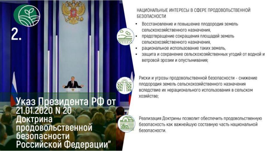 В документе прямо обозначены задачи по предотвращению сокращения земель сельскохозяйственного назначения, по защите и сохранению сельхозугодий от водной и ветровой эрозии, от процессов опустынивания. Это системная государственная постановка вопроса.