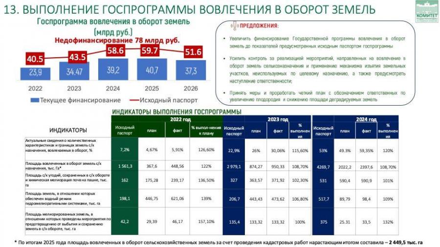Поэтому крайне важно, что сегодня работа переведена в системный формат. Проведено картирование почв и межевание, а показатели ввода брошенных земель доведены до каждого региона. Это принципиально. Каждый субъект должен чётко знать свой объём ответственности. Губернатор обязан отвечать за вовлечение земель, за мониторинг их состояния, за сохранение и повышение плодородия.