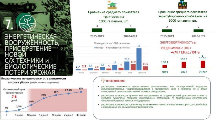 Но давайте зададим себе честный вопрос: о какой технической вооруженности мы можем говорить, если при биологическом урожае порядка 170 миллионов тонн мы вынуждены убирать его по пять–шесть месяцев?