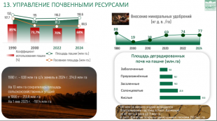 Обращаясь слайду, хочу еще раз акцентировать внимание на Указе Президента от 2020 года и национальных целях. Президент уделяет особое внимание восстановлению и повышению плодородия земель, предотвращению и сокращению земель сельскохозяйственного назначения, а также защите и сохранению сельскохозяйственных угодий от эрозии и опустынивания. Обеспокоенность Президента угрозой продовольственной безопасности, связанной со снижением плодородия сельскохозяйственных земель вследствие их нерационального использования, абсолютно обоснована, для нас это стратегический сигнал.