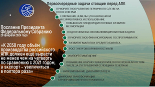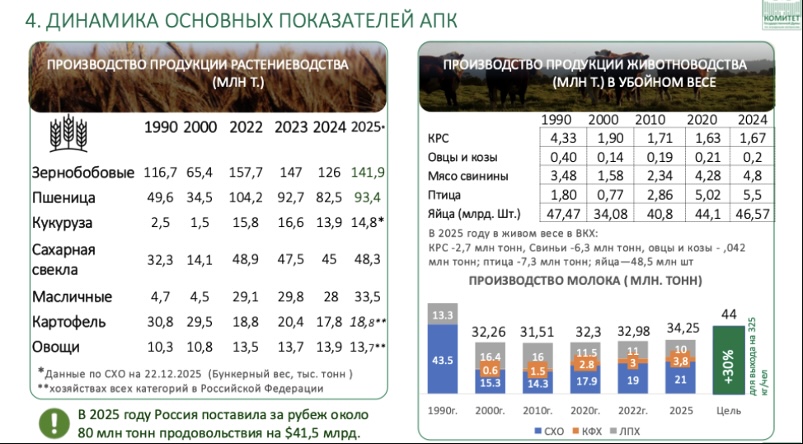 Прежде всего, хочу выразить благодарность труженикам села за достигнутые результаты в прошлом году. Несмотря на сложные погодные условия, аграрии собрали 142,5 млн тонн зерна. По ряду других культур, требующих особых технологий и подверженных климатическим рискам, были достигнуты рекордные показатели. Эти достижения, отражённые в представленных слайдах, являются серьёзным успехом всех отраслей сельского хозяйства.