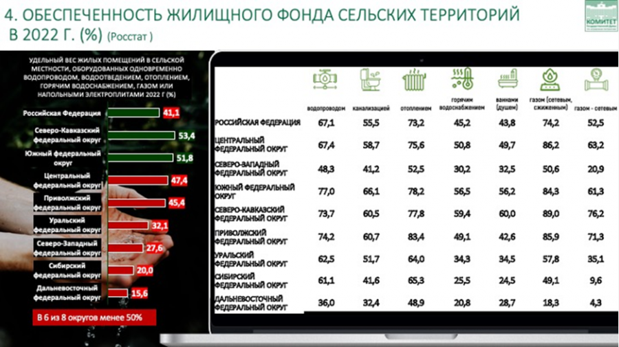 Президентом страны поставлены три ключевые задачи: сохранить сельское население, выровнять доходы сельских жителей и обеспечить сопоставимые с городскими условия жизни на селе. Однако, если мы посмотрим на статистику по федеральным округам, картина тревожная. В отдельных федеральных округах сокращение сельского населения достигает 14 процентов, на Дальнем Востоке — до 17 процентов.