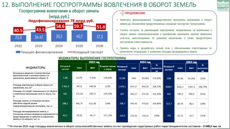 На сегодняшний день в рамках Госпрограммы "Земля" минсельхозом проведена огромная работа: сделана карта-схема земель, завершена почвенная карта по всей стране, проведена инвентаризация границ сельскохозяйственных угодий. В результате видим реальную картину: около 19 миллионов гектаров в разных регионах без признаков обработки почвы. Из них около 15 миллионов находятся в собственности, но не вовлечены в работу, и ещё порядка 5 миллионов гектаров фактически оформлены, но не обрабатывается. Вывод напрашивается печальный - наши земли и сельхозугодья никому не нужны. Такое отношение к земле - матушке не должны допускать. При этом с 2022 года действует Государственная программа эффективного вовлечения в оборот земель сельскохозяйственного назначения и развития мелиоративного комплекса Российской Федерации, в которой установлена цель – вовлечь к 2030 году не менее 13,2 млн гектар земель. За первую пятилетку введено около 4 миллионов гектаров, в устойчивом обороте — порядка 3 миллионов. Работа идёт, но темпы недостаточны. Если мы выйдем на 13 миллионов гектаров дополнительно, общий объём пашни в обороте увеличится с нынешних 81–82 до 92–93 миллионов гектаров.