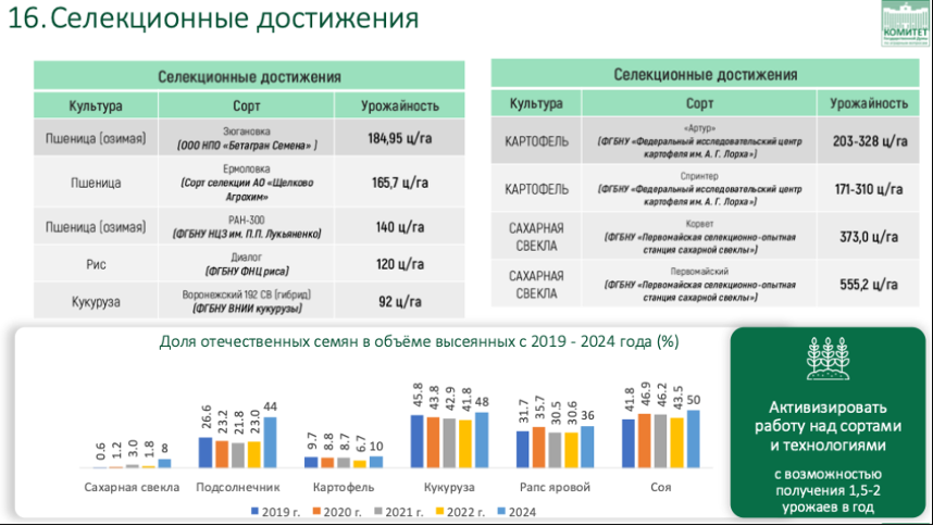Посмотрите на слайде на результаты современной селекции, достижения наших ученых, урожайность сорта «Зюгановка» до 180 центнеров с гектара, сорт «Ермоловка» - 130–140 центнеров, сорта РАН-300 Национального центра зерна имени Лукьяненко - урожайность 140 центнеров с гектара. Причём эти селекционные сорта демонстрируют высокую урожайность не только в центральных и южных регионах, но и в Оренбургской области, в Алтайском крае. Еще несколько десятилетий назад, трудно было представить, что можно получить в этих регионах 8 центнеров с гектара. Это говорит о высоких достижениях наших ученых селекционеров. Поэтому важно не отставать в освоении современных технологических систем - включая цифровизацию, системы управления производственными процессами, мониторинг полей, беспилотные комплексы. Всё, что связано с управлением каждой стратегической целью в агропромышленном комплексе, должно работать на результат.