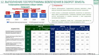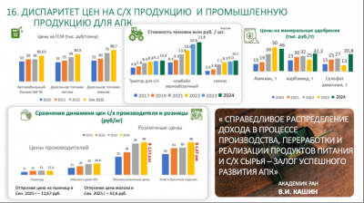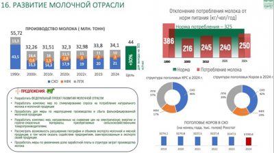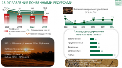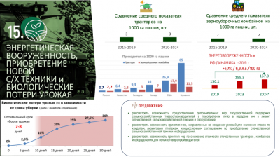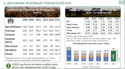 Прежде всего, хочу выразить благодарность труженикам села за достигнутые результаты в прошлом году. Несмотря на сложные погодные условия, аграрии собрали 142,5 млн тонн зерна. По ряду других культур, требующих особых технологий и подверженных климатическим рискам, были достигнуты рекордные показатели. Эти достижения, отражённые в представленных слайдах, являются серьёзным успехом всех отраслей сельского хозяйства.
