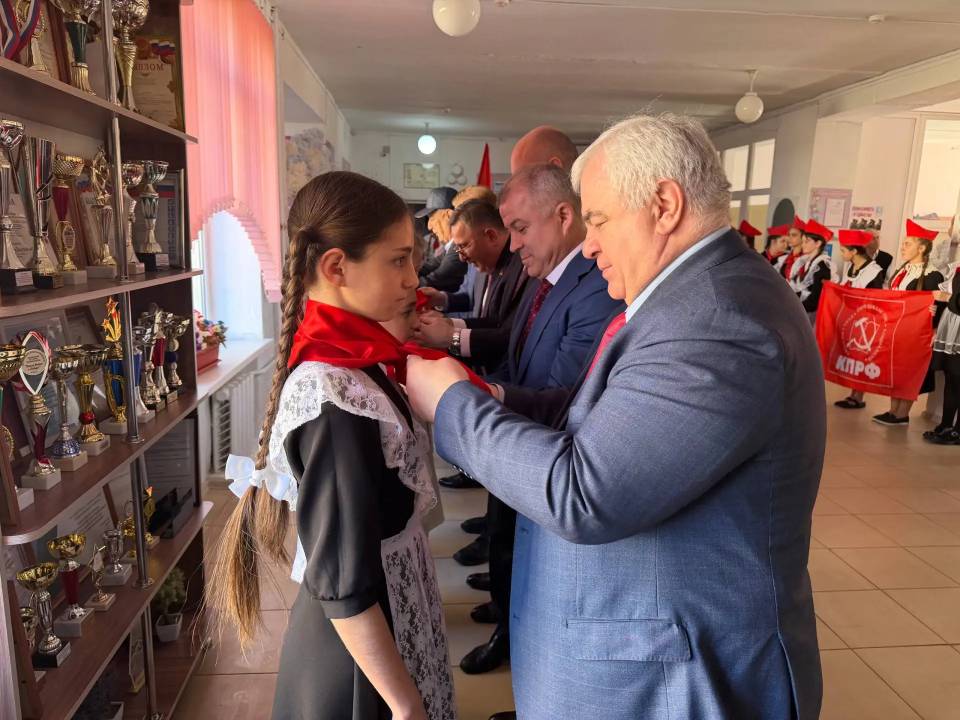 Затем делегация направилась в Кабардино-Балкарию. В среднеобразовательной школе им. Х.Х. Долова Казбек Тайсаев вместе с первым секретарем Кабардино-Балкарского рескома КПРФ Б.С. Паштовым, первым секретарем Северо-Осетинского рескома КПРФ Ч.А. Дудати и первым секретарем Дагестанского рескома КПРФ С.К. Абдулхаликовым и приняли участие в торжественной церемонии принятия в пионеры. Казбек Тайсаев поздравил учеников с посвящением в ряды пионеров: «Ребята, поздравляю вас со вступлением в пионеры! Быть пионером — значит любить Родину, быть верным товарищем, упорным в учебе, смелым в начинаниях и неравнодушным к окружающему миру. С гордостью несите это звание!». В завершение мероприятия К.К. Тайсаев наградил директора и преподавателей школы медалями КПРФ «100-летие Всесоюзной пионерской организации им. В.И. Ленина».