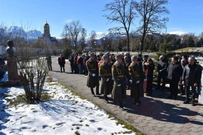 К собравшимся обратился Казбек Тайсаев: «Товарищи, хочу прежде всего передать вам теплые приветствия от Председателя ЦК КПРФ Геннадия Андреевича Зюганова, заместителя Председателя ЦК КПРФ Владимира Ивановича Кашина, Ивана Ивановича Мельникова и всего руководства партии. Мероприятия в честь Дня памяти Иосифа Виссарионовича Сталина пройдут по всей стране, на Красной площади десятки тысяч человек возложат цветы к Могиле Генералиссимуса. Сегодня, в условиях Специальной военной операции, когда мы снова воюем против фашизма, никому не нужно объяснять роль Сталина – именно Иосиф Виссарионович заложил основы военного могущества нашей страны. Совсем недавно мы были на передовой – наши ребята воюют мужественно и героически, за них берет гордость! В Республике Хакасия, которую возглавляет наш товарищ, коммунист Валентин Коновалов, планируется установить памятник Генералиссимусу – убежден, эта важная инициатива будет реализована. И в ряде других регионов стараниями коммунистов будут установлены бюсты Иосифа Виссарионовича Сталина, творца нашей Великой Победы». После возложения цветов состоялась церемония прохождения почетного караула.