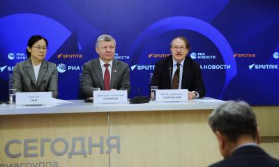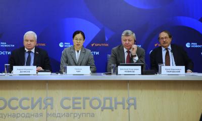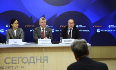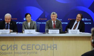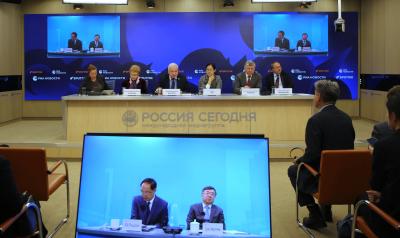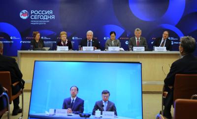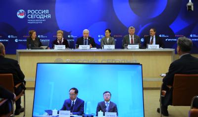 Встречу в Международном мультимедийном пресс-центре медиагруппы "Россия сегодня" дополнил видеомост с Пекином. Его тема звучала так: "Якорь стабильности и крылья развития: новая архитектоника глобального управления глазами экспертов из Китая и России".