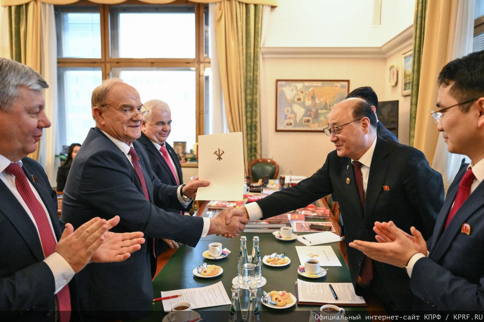 Геннадий Зюганов отметил важность успешного проведения IX съезда Трудовой партии Кореи (ТПК) и единодушного избрания товарища Ким Чен Ына на пост Генерального секретаря ТПК. В свою очередь, Син Хон Чхоль проинформировал о работе съезда в Пхеньяне, в котором он принимал участие. Лидеру КПРФ было вручено официальное информационное письмо Центрального комитета ТПК об итогах съезда.