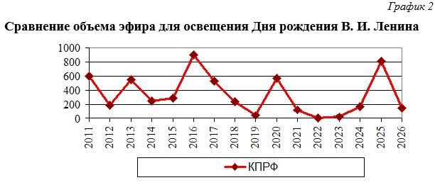 В 2026 году объём освещения мероприятий КПРФ в годовщину со Дня Рождения В. И. Ленина упал по сравнению с 2025 годом в пять раз и составил 2 минуты 28 секунд эфира.