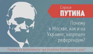Да, кстати, на вопрос московских пикетчиков, который поддержали несколько тысяч человек - «Почему в Москве, как и на Украине не разрешают провести референдум?» - Путин так и не ответил.