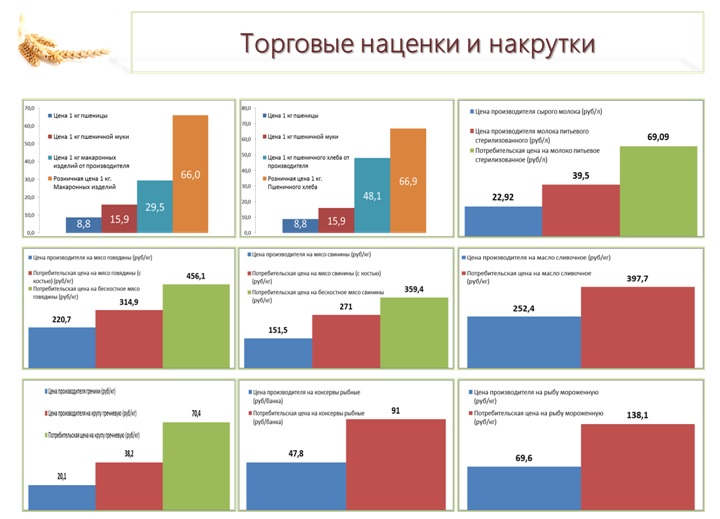 Посмотрите – пшеница 3-го класса стоит 8,8 руб./кг. Из нее сделали муку – уже 16 рублей стоит. Из нее сделали хлеб – уже 48 рублей, а продают уже за 67 рублей за килограмм. По макаронным изделиям – то же самое.