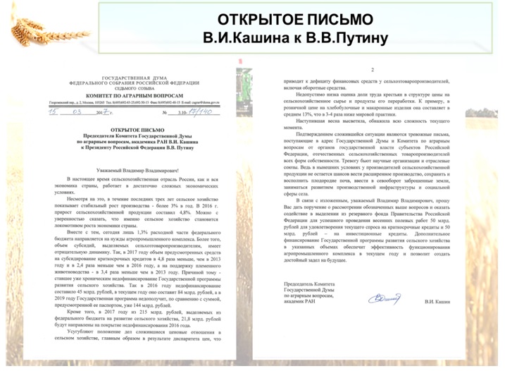 Выступление заместителя Председателя ЦК КПРФ, Председателя Комитета ГД ФС РФ по аграрным вопросам, академика РАН В.И.Кашина на заседании итоговой Коллегии Минсельхоза России по вопросу «Об итогах реализации в 2016 году госпрограммы развития сельского хозяйства и регулирования рынков сельскохозяйственной продукции, сырья и продовольствия на 2012-2020 годы»