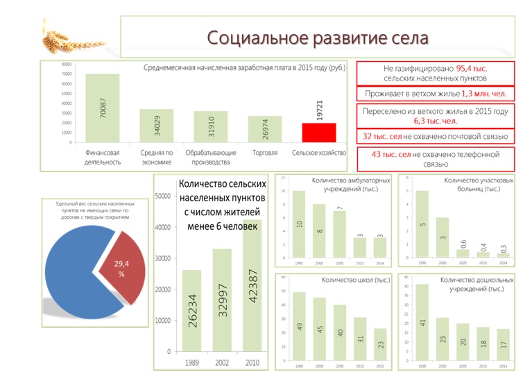 Нужно возродить Федеральную программу социального развития села. Используемое сегодня понятие «устойчивость сельских территорий» - слишком общее. Отстраивая в год всего 130 фельдшерско-акушерских пунктов на всю Россию при том, что тысячами их ликвидировали, как и дома культуры, и многие другие объекты социальной инфраструктуры – мы проблему не решим за многие годы. А у нас еще в более чем 90 тыс. деревень нет газа, в 43 тыс. деревень нет телефонной связи, повсеместно усугубляется ситуация с дорогами, детскими садами, школами, объектами торговли, жильем, водоснабжением, и т.д. Поэтому у нас и деревень становится все меньше и меньше.