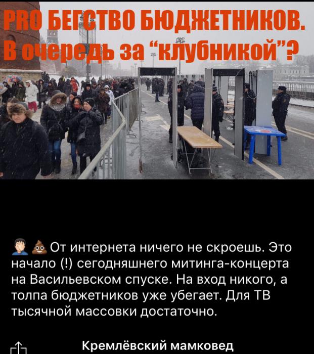 «План по валу» и «вал по плану» коллеги @Chesnakov выполнили. Бюджетники, чиновный люд и работники госкорпораций составили на площадях нужную массовку. Кстати, «аполитичные» главы госкорпораций почему-то недоумевают – а почему нас включили в санкционные списки? Догадайтесь с трех раз? Думаете, что наши геополитические оппоненты не знают про управление страной через «телекартинку» и кто главный поставщик декораций и организатор управляемого голосования? Но это так, заметки на полях…