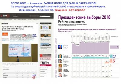 В одном отчете у Жириновского рейтинг 5,5 проц., в другом – 7. В одном отчете Грудинин опережает Жириновского с рейтингом 6,5 проц., в другом – отстает с рейтингом 6. Подчеркну – это один и тот же опрос. Для двух заказчиков приятные им данные. Только разные?