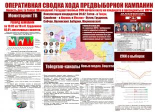 20 февраля резко негативная агитация на федеральном телевидении против П.Грудинина вновь вышла на пиковые значения. Деятельность каждого из других кандидатов в президенты РФ освещалась федеральным телевидением в нейтрально-позитивном ключе.