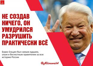 Разрушение 65% промышленного производства, утилизация своего сельского хозяйства, зависимость от импорта продуктов, обнищание населения, уничтожение армии и флота, военно-промышленного комплекса. Деградация образования, здравоохранения, убийство науки и РАН, криминализация всех сфер жизни – все эти «достижения» первого Президента должны были предопределить отсутствие каких-либо его сторонников в будущем. Однако такие все же находятся и из последних сил стараются хоть как-то оправдать своего кумира.