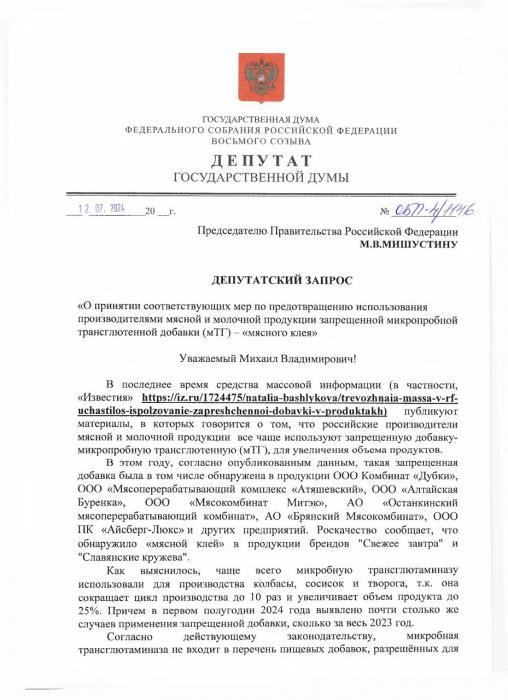 В связи с ‘этим я подготовил и направил депутатские запросы Председателю Правительства Российской Федерации М.Мишустину, а также руководителям Минпромторга, Россельхознадзора и Роспотребнадзора, в которых попросил пресечь использование в производстве и свободную продажу «мясного клея», а также жестко изымать его из оборота.