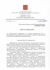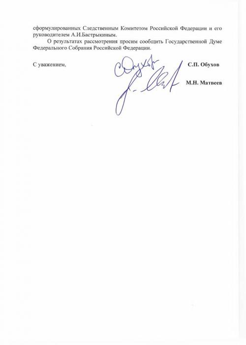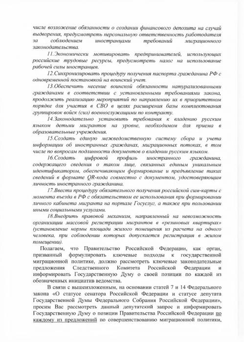 В связи с вышеизложенным, на основании статей 7 и 14 Федерального закона «О статусе сенатора Российской Федерации и статусе депутата Государственной Думы Федерального Собрания Российской Федерации», просим Вас рассмотреть данный депутатский запрос и информировать Государственную Думу о позиции Правительства Российской Федерации по каждому из предложений по совершенствованию миграционной политики, сформулированных Следственным Комитетом Российской Федерации и его руководителем А.И.Бастрыкиным.