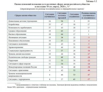 Более всего (ТОП-7) негативные оценки изменения ситуации россияне выделили в таких сферах: Политические свободы граждан (разница позитивных и негативных изменений -20 п.п.), коррупция ( -22), ситуация в сфере морали (-24), международные позиции России (-30), ситуация с приезжими (-46), уровень межнациональной напряженности (-47) ситуация с терроризмом (-57).