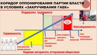 Коридор легального оппонирования партии власти все больше сужается. В системе координат «сервильность» - «оппозиционность» все больше сдвигаются соответствующие «красные линии»: «зона ликвидации политсубьекта», «зона политрепрессий», «зона административного прессинга». Тем самым, сужается зона возможного политического оппозиционного маневрирования. Кстати, часть думских политсубьектов уже эволюционировали в «зону сервильности», где раньше доминировали только «партии-обманки».