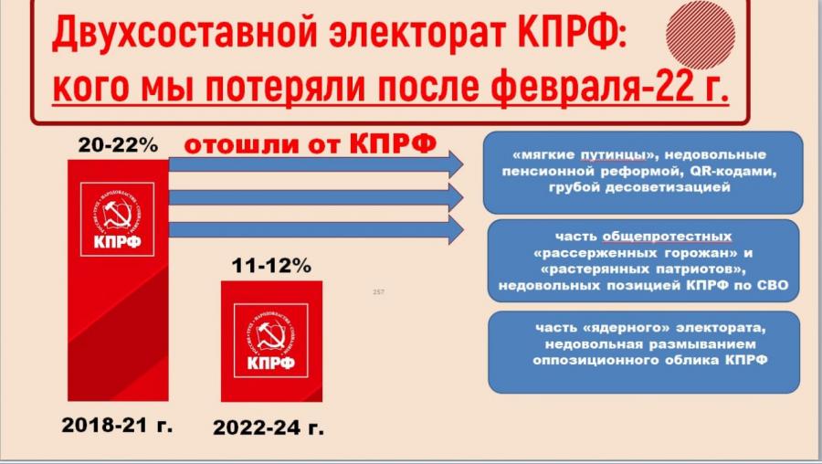 Да, по сравнению с выборами 2020-2021 года двухсоставной (ядерно-идеологический и общепротестный, ситуативный) электорат КПРФ «усох» за счет сокращения доли общепротестников. Но они в перспективе никуда от КПРФ не денутся, если Компартия сохранит статус главной оппозиционной силы.
