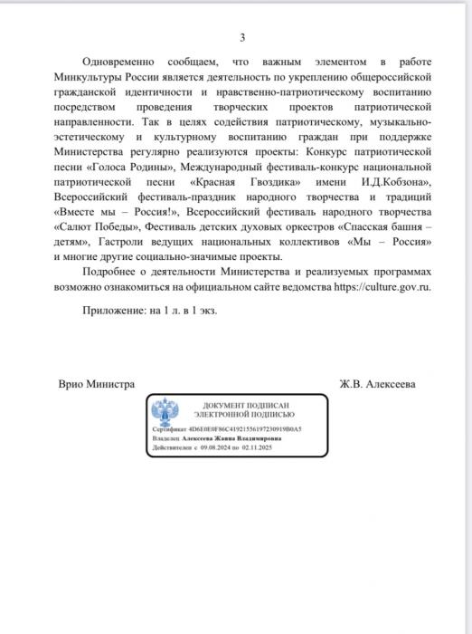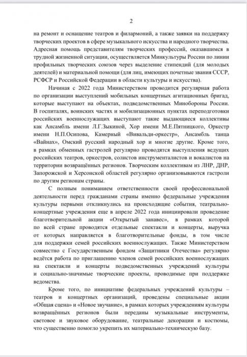 А из ответа, присланного Минкультом, я узнал лишь о многочисленных культурных мероприятиях, проводимых этим ведомством. Что же касается вопросов, поднятых в моем депутатском запросе, то отмечается, что