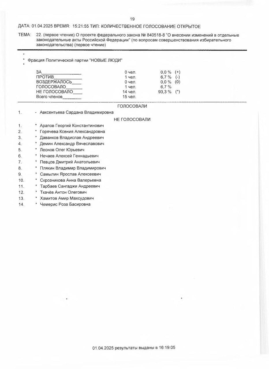 1 апреля 2025 года Госдума в первом чтении рассмотрела проект федерального закона №840518-8 «О внесении изменений в отдельные законодательные акты РФ», предлагающий ряд новаций в избирательном законодательстве.