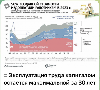Владельцы капитала забирают всё больше: в современной России доля трудящегося во вновь созданной стоимости — лишь 42%. Эксплуатация остаётся на максимальном уровне за последние 30 лет - 58% созданной стоимости отчуждается от трудящегося.