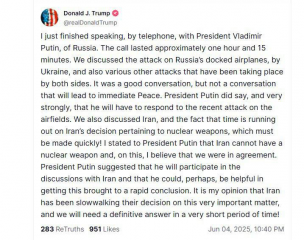 «Внезапный звонок Трампа … снял возможность ответа ядренбатоном. Достигнута договоренность, какой будет ответка. Сразу прошел Совбез. Куда и чем ударят, это вы у Трампа спросите… Кстати, дронобойню из дронофур провели американцы. США никому и никогда не доверят подготовку к атаке на ядерную триаду РФ. И саму атаку тоже. Атака на Крымский мост – это демонстрация возможностей».