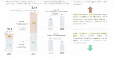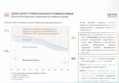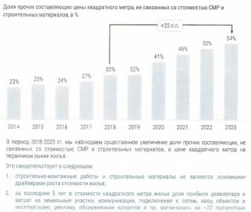 Доля же непосредственных расходов на строительство в цене 1 кв метра - в т.ч. расходов на оплату труда строителей, стабильно снижается. Если в 2018 году она составляла 68%, то в 2023 уже 46%.
