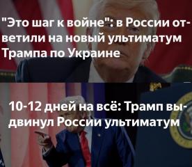 - Сокращение сроков и отказ от диалога: Президент США Дональд Трамп сократил срок для достижения перемирия на Украине с 50 до 10–12 дней (с 28 июля 2025 г.), мотивируя это отсутствием прогресса в переговорах с В. Путиным. Он также заявил, что »утратил интерес к разговорам» с российским лидером и не планирует новых контактов без официального приглашения в Китай .