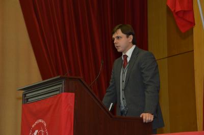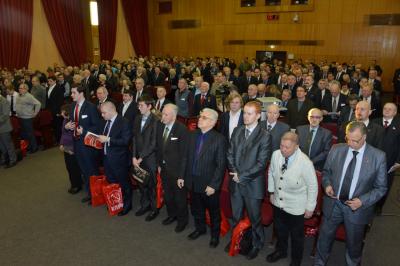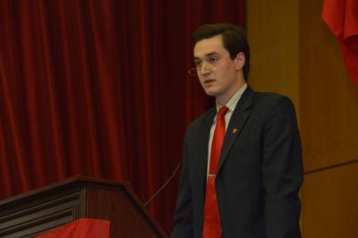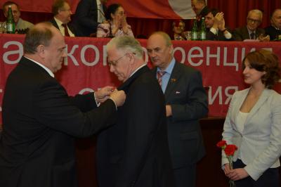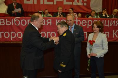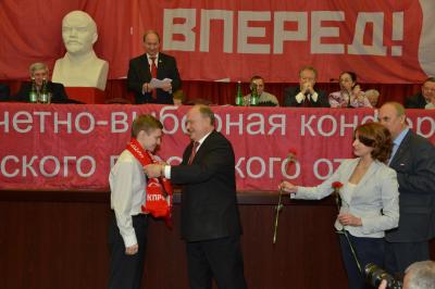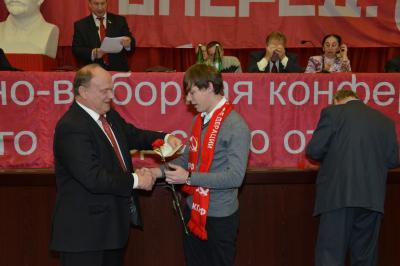 Открылась конференция пионерским приветствием. Затем Г.А. Зюганов вручил партийные и комсомольские билеты вновь принятым товарищам, а также награды КПРФ заслуженным членам партии.