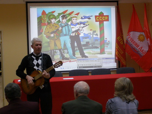 Вторая часть встречи – это совместное исполнение военных песен самодеятельными артистами и публикой. Дирижировал дружным «хором» поэт и работник военной культуры Александр Трутнев. Духоподъемно звучали голоса заслуженных клубных работников самодеятельности Татьяны Чигизенко и Марии Дроздовской, «барда с гитарой» Александра Каргина, социолога и поэтессы Татьяны Чернышовой.