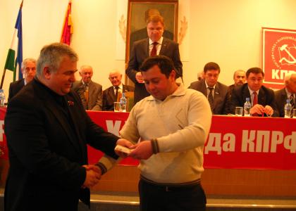 Не менее тепло зал приветствовал сообщение о награждении депутата фракции КПРФ в Государственной Думе ФС РФ А.Ж. Бифова Почетной грамотой Кабардино-Балкарской Республики за плодотворную общественно-политическую деятельность и большой вклад в социально-экономическое развитие республики.