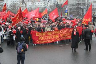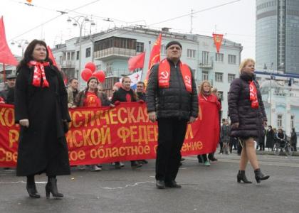 Колонну возглавляли лидеры Свердловского областного Комитета КПРФ, затем, скандируя революционные лозунги, шли комсомольцы. Справа шли участники движения «Дети войны» с «социальными» плакатами. Слева члены РОТ-Фронта, РКРП-КПСС и ВКП(б). В центре колонны екатеринбургский ЛКСМ РФ нес растяжку «Антикапитализм». Со своими транспарантами шли каждые местные отделения КПРФ города. Были представлены Кировский, Ленинский, Железнодорожный, Октябрьский, Чкаловский, Верх-Исетский и Орджоникидзевский районные комитеты. Следом шагал актив «Союза Советских офицеров» и партии «Воля». За военным ветеранами шли члены профсоюза «Учитель», межрегиональный профсоюз работников образования, профсоюз работников медицины «Действие» и движение учащихся «Студенческое действие». Рядом шли экологи и антифашисты. Замыкали шествие представители левацкого конгломерата от анархистов Автономного действия и анархо-коммунистов, либертарных коммунистов, демократических социалистов, общественников из комитета рабочего интернационала, городского творческого клуба имени Хосе Марти.