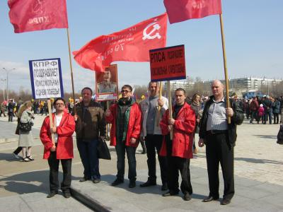По сложившейся традиции в День Победы коммунисты Комсомольска-на-Амуре идут в общегородской колонне со своими плакатами и флагами. В этом году администрация города настоятельно попросила КПРФ занять место в конце праздничной колонны. В результате копия Знамени Победы, которую несли члены КПРФ, оказалась на задворках демонстрации. Так и прошла по городу демонстрация – от площади Ленина до площади Славы – копия Знамени Победы на машине, возглавляющей колонну и копия Знамени Победы у коммунистов, замыкающих шествие.