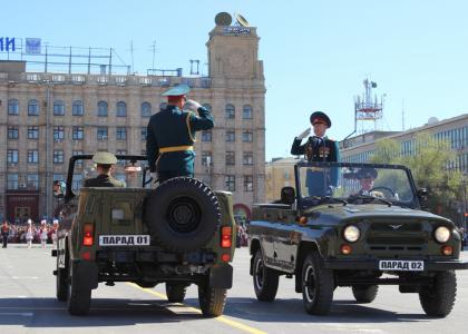 Торжественным маршем по главной площади города прошли военнослужащие 20-й мотострелковой и 56-й десантно-штурмовой бригад, железнодорожного корпуса, бригады внутренних войск, военнослужащие роты Почетного караула. Механизированную колонну возглавил легендарный танк Т-34. За ним проследовали ретроавтомобили ГАЗ-369 и «Виллис», бронеавтомобиль «Тигр», боевая разведывательная дозорная машина БРДМ-2М, БТР-80, артиллерийская система «Рапира» и «Град-М». Специально к празднованию Дня Победы Сводный оркестр Волгоградского гарнизона исполнил парадные, встречные марши, а также несколько маршей времен Великой Отечественной войны.