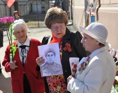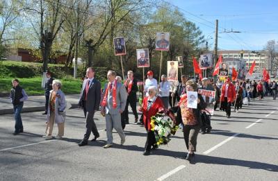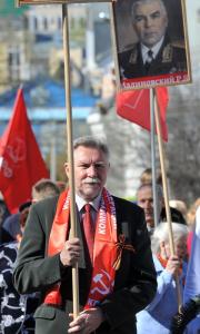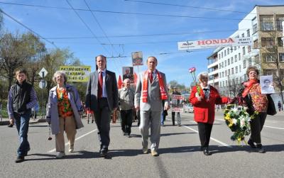 По призыву коммунистов, участники шествия несли портреты маршалов Советского Союза и своих родственников, которые воевали на фронтах Великой Отечественной войны. Присутствие портретов воинов, сражавшихся с оккупантами за будущее своих детей и внуков, наполнило шествие великим смыслом – Память. Возникало ощущение, что фронтовики идут в колонне вместе с нами, плечом к плечу, под Красными Знаменами, как в те далекие боевые годы.