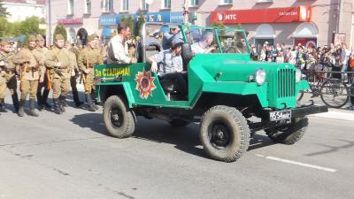 Колонна под красными знаменами, с портретами Ленина, Сталина и полководцев Победы начала движение от сквера Мира. Впереди – Знамя Победы. Возглавляют колонну ветераны Великой Отечественной войны.