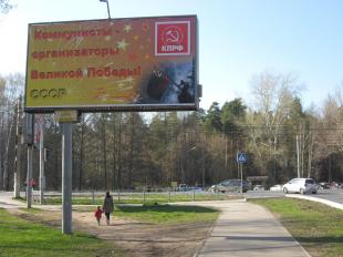 Большие щиты, на которых красные буквы словно зарождаются в искрах победного салюта, развевается красное советское знамя над поверженным рейхстагом, и словно подпись – эмблема КПРФ, расположены на оживлённых магистралях города. Один из таких щитов встречает каждого, кто прибывает в город, прямо у вокзала Пермь-II - железнодорожных ворот столицы Прикамья.