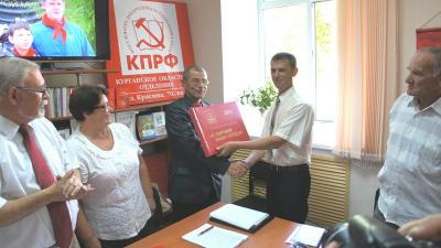 В торжественной обстановке состоялась передача альбома-эстафеты «С партией наши сердца!» от Шадринского городского Далматовскому районному отделению КПРФ, которое осуществили под аплодисменты всех участников пленума В.И. Усанов и Н.И. Попов.